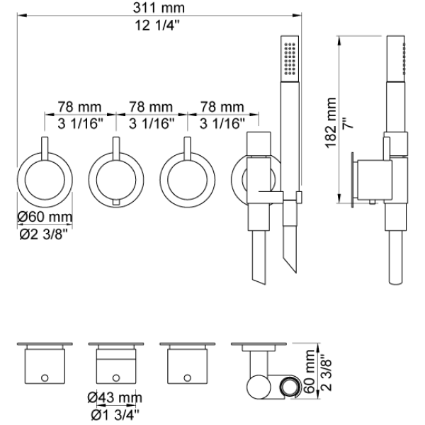 Innbyggt sturtusett með blöndunartæki, handsturtufestingu, handsturtuhaus og sturtubarka. Vola sturtuhaus og sturtustöng er selt sér.